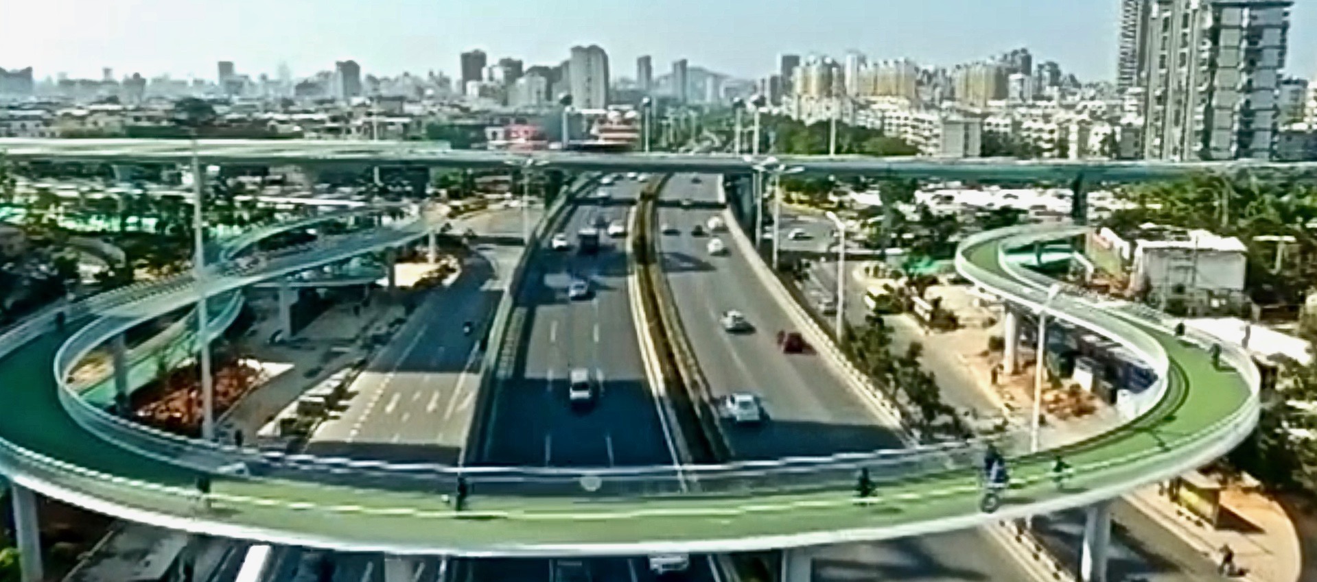 Xiamen just completed a 4.7 mile aerial bikeway linking six transit hubs and capable of supporting 2000 cyclists per hour.