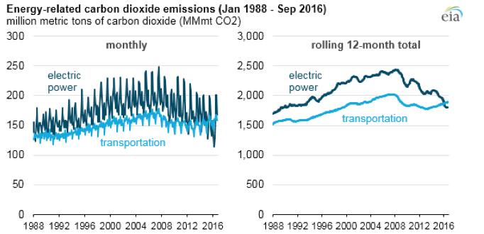 [4] “U.S. CO2 emissions from the transportation sector reached 1,893 million metric tons (MMmt) from October 2015 through September 2016, exceeding electric power sector CO2 emissions of 1,803 MMmt. On a 12-month rolling total basis, electric power sector emissions are now regularly below transportation for the first time since the late 1970s.”; Power sector carbon dioxide emissions fall below transportation sector emissions, U.S. Energy Information Administration, http://tinyurl.com/y9gwrqpw