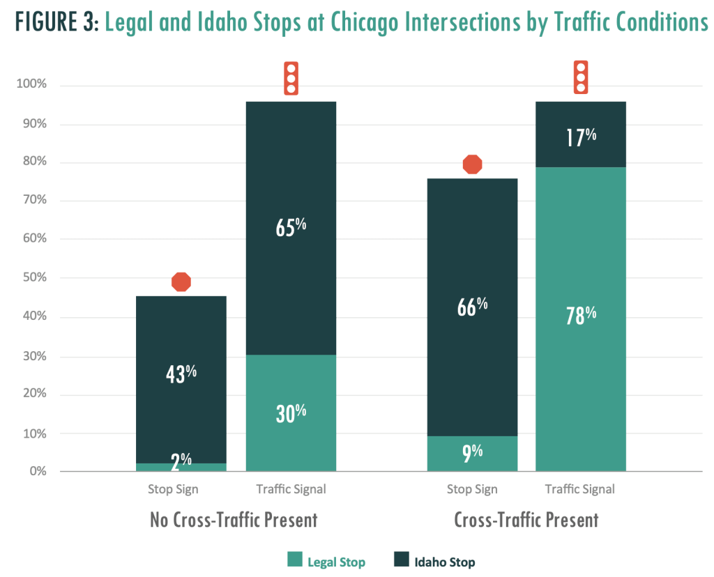 For context, a 2016 study in Chicago determined that 95% of cyclists approaching a signaled intersection either stopped for the full duration of the red light, or stopped-and-restarted, depending on traffic conditions. Only 5% continued without stopping.