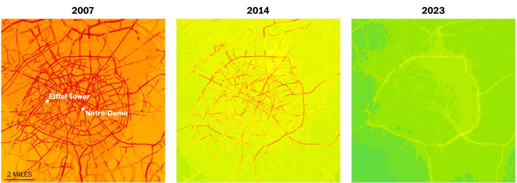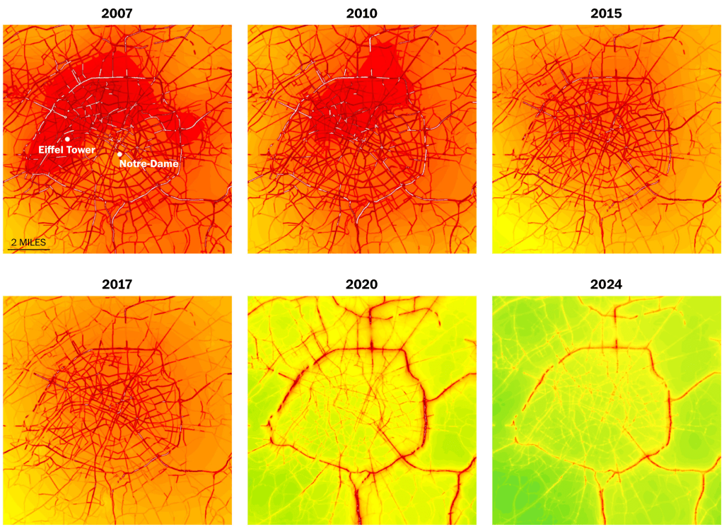Today, Paris rush hour bike commutes comprise 18.9% of total vs. 6.6% by car. France overall has 2/3 fewer pedestrian fatalities per capita than the U.S. And the improvement in air quality has been remarkable.