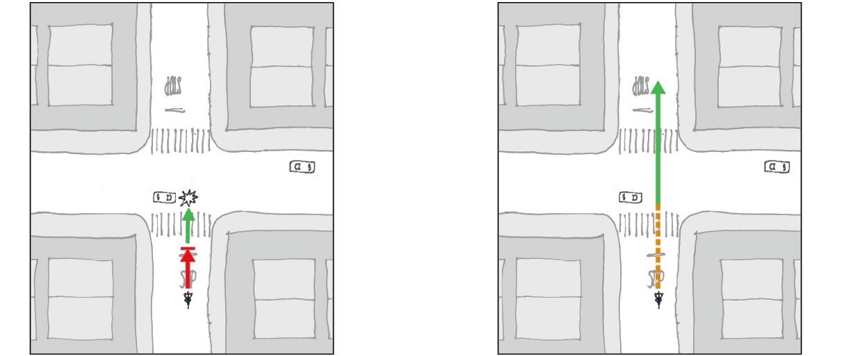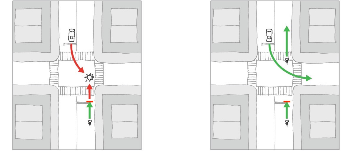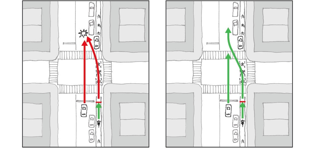 Enabling cyclists to enter an intersection before a green light gets them out of truck drivers’ blind spots, safely past blocked bike lanes and ahead of cars turning left—the most common scenarios that put cyclists at risk.