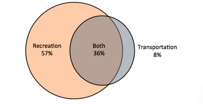 Nationally, twice as many people bike for recreation as transportation. This infers that projects which prioritize recreational use will draw twice as many users vs. those that facilitate commuting.