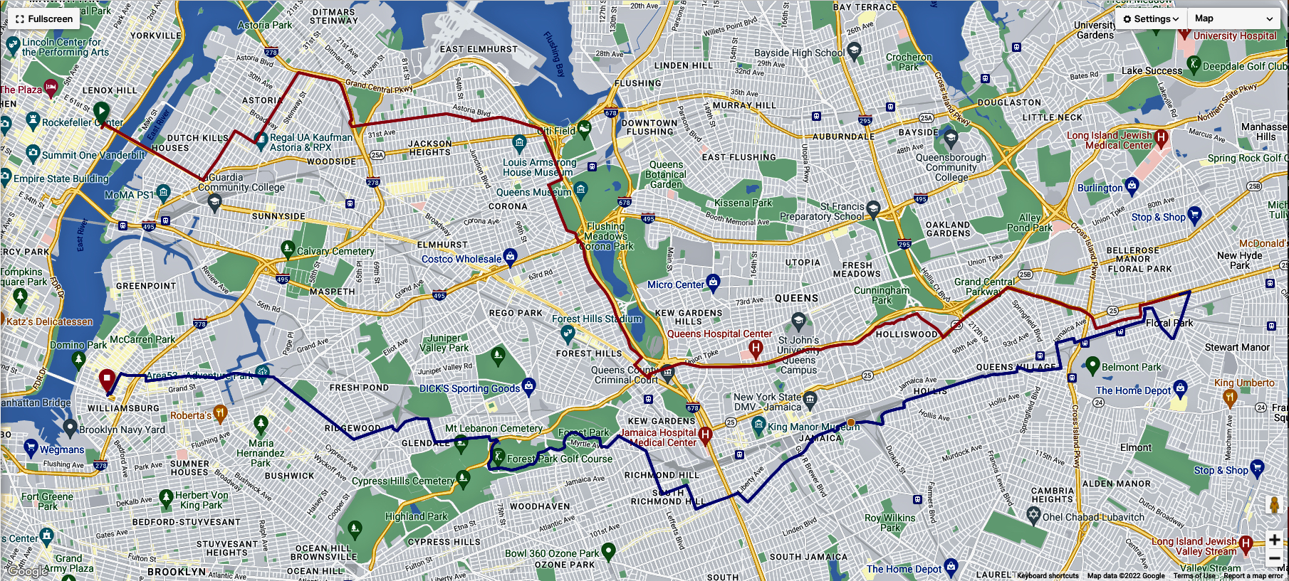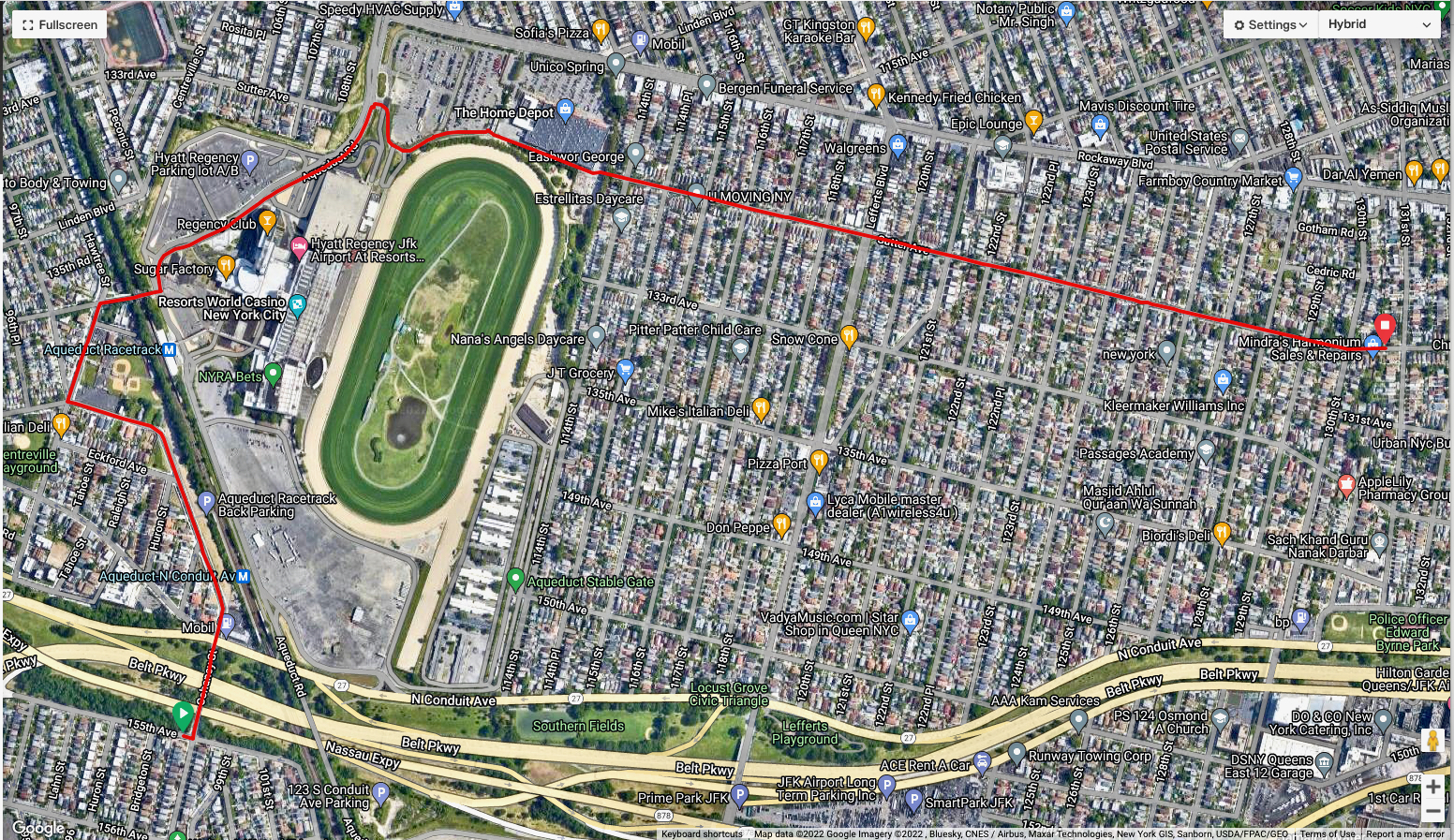 From Queens #5 – Richmond Hill, mile 19.1-22.5 routes through Aqueduct Raceway and Home Depot parking lots to bypass Rockaway Boulevard.