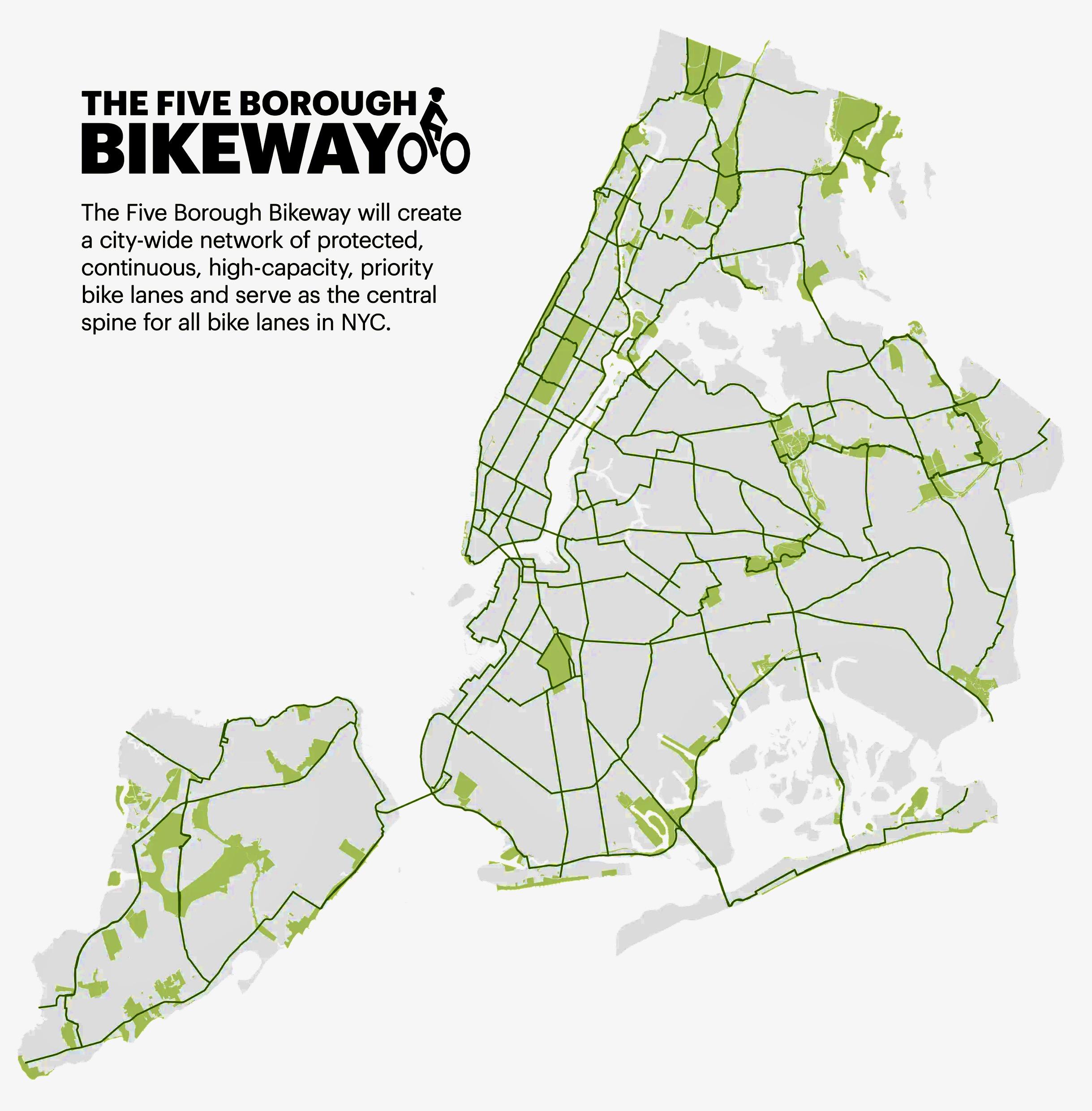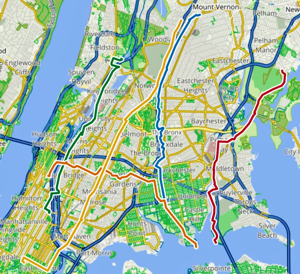 - Aggregate NYC’s 1500 miles of bikeways and on-road bike lanes plus quiet residential streets and commercial areas that are empty on weekends (“industrial parks”)