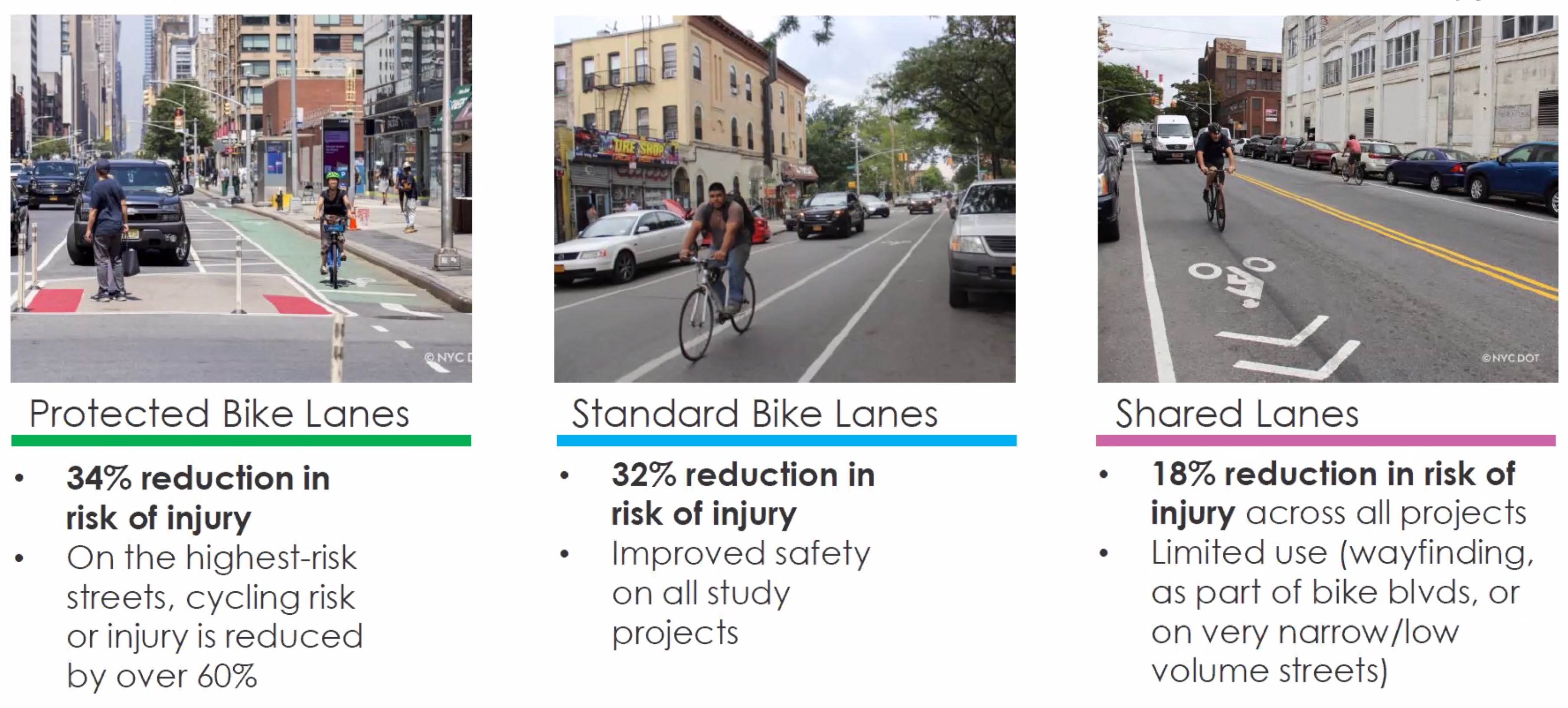 Adding a standard bike lane to a low stress road achieves the same level of harm reduction (32%) as a protected lane (34%). So it follows that a network of low stress roads would be simpler and less costly to upgrade.