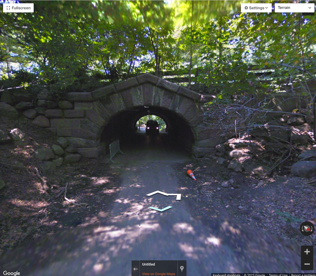 “The main method used to separate the pedestrian from vehicular traffic is by means of a series of arches at strategic points which carry the drives over the walks. Eastwood Arch, built 1867-68, allowed the pedestrian arriving from the Willink entrance to pass beneath the East Drive and a bridle path into the Nethermead by the Lullwater.” – Presentation for Prospect Park to Landmarks Preservation Commission, 11/25/75. P. 6, https://tinyurl.com/2p8zywy9