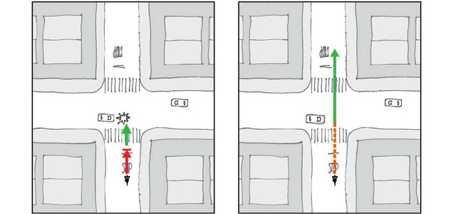 This implies that legislation that enabled cyclists to slow through stop signs—a random element similar to a three-way stop—would also make motorists safer.