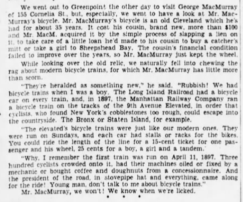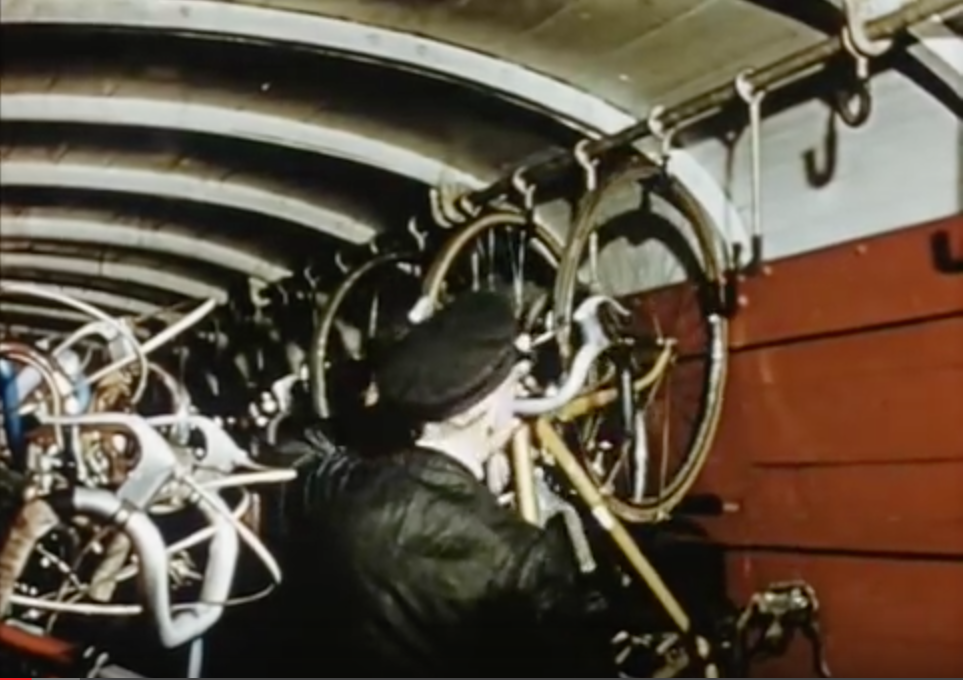 – In 1955, British Transport Films produced Cyclists’ Special to promote weekend excursions from London to the English country side. Service included on board dining and specially configured luggage cars to store quantities of bicycles.