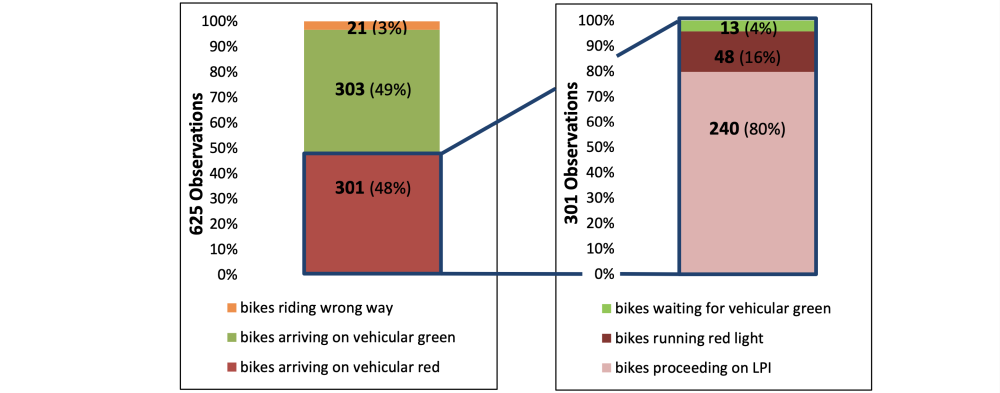 Relevant data can be found in a controlled study of cyclists who were allowed to proceed during “leading pedestrian intervals” (“LPIs”)—a functional equivalent of Stop-as-Yield. Takeaway: When cyclists were allowed to enter an intersection during the LPI, red light violations dropped 66%.