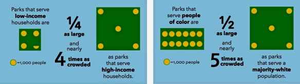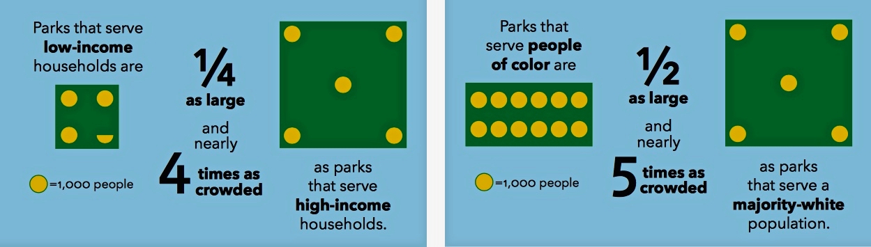 2 “Parks serving primarily nonwhite populations are half the size and five times more crowded than parks that serve majority white populations. Parks serving majority low-income households are four times smaller and four times more crowded than parks that serve majority high-income neighborhoods.” “The Heat is On,” The Trust for Public Land, August 2020, p. 2, https://tinyurl.com/y638cmtw