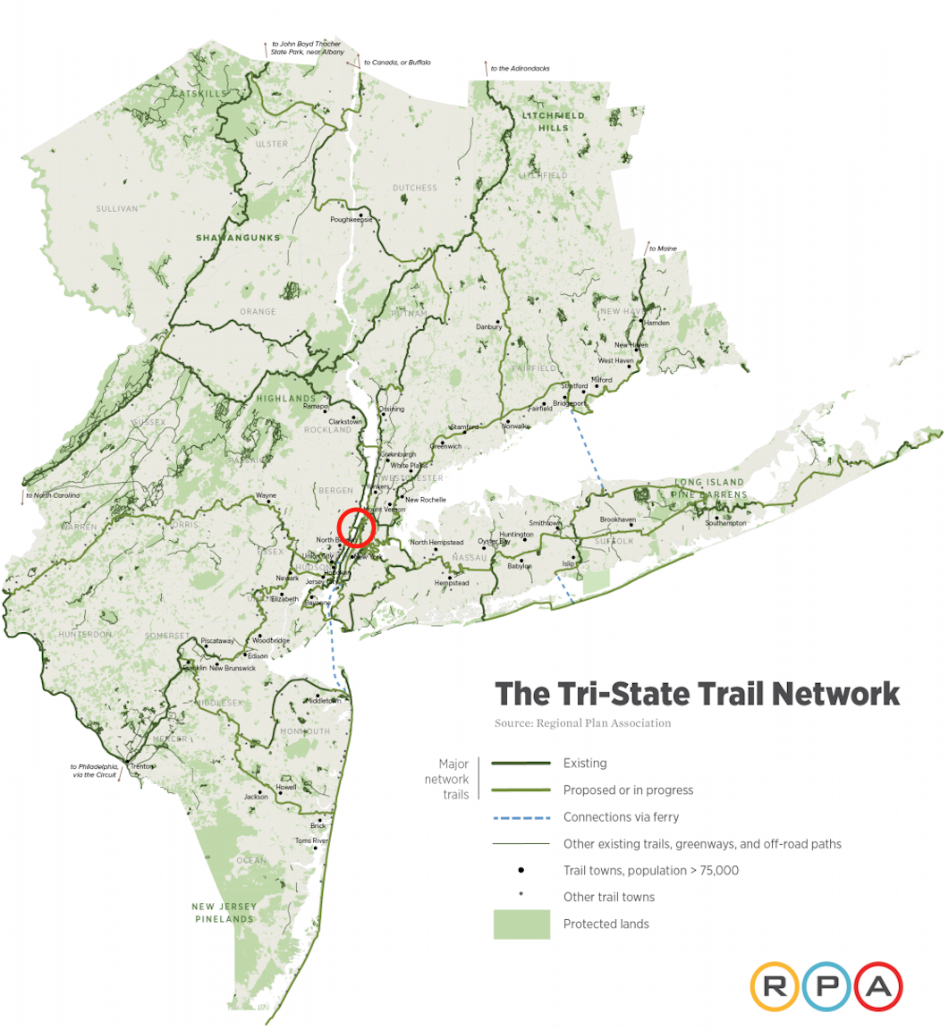 [6] “Creating an effective network also means improving existing trails and connections. In particular, the connections between the greater region and New York City include major bridge crossings – such as the Brooklyn and George Washington Bridges – that are likely to be in high demand by many users”; RPA Proposes Extending and Connecting Region’s Trails to Form a Unified Network, Regional Plan Association, http://tinyurl.com/ydba4gk5