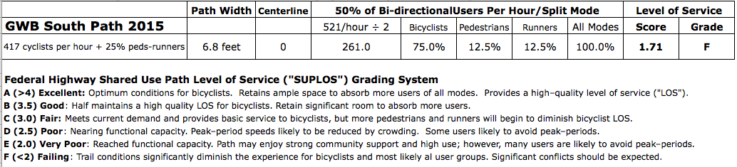 [10] FHWA grading for the GWB South Path was an “F-failing” during 2014-2015: “Significantly diminishes the experience for at least one, and most likely for all user groups. Significant user conflicts should be expected (emphasis added); Shared-Use Path Level of Service Calculator, A User’s Guide, Federal Highways Administration, http://tinyurl.com/y72nocnk