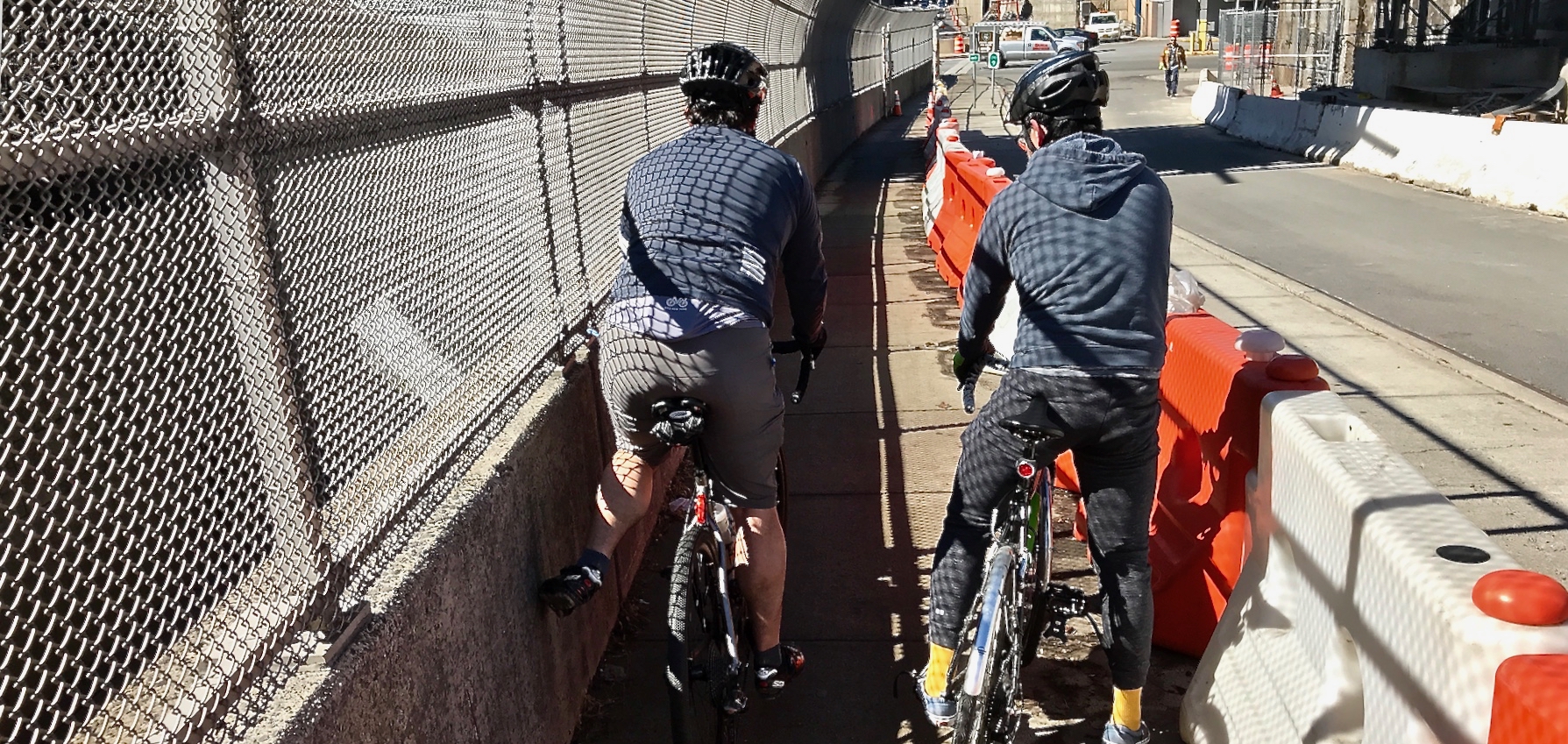The photo on below depicts two cyclists straddling their bike in the New Jersey approach to the GWB South Path. At five foot across, the approach is ADA-compliant.7 But for the thousands of pedestrians and cyclists who’ll use it each day, AASHTO specifies 14 foot.