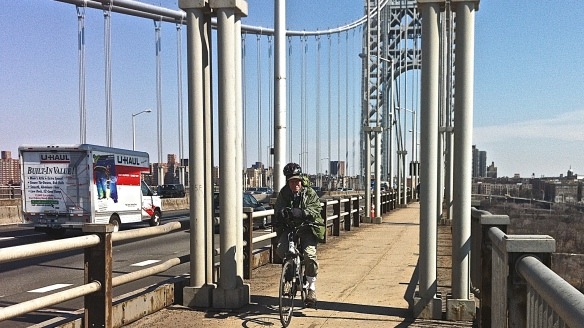 The first photo is the George Washington Bridge. 7′ wide path. Guard rails just over 4 feet high. No wind protection. The cyclist that day was subject to gusts of 30 miles per hour.